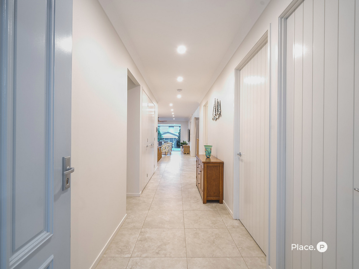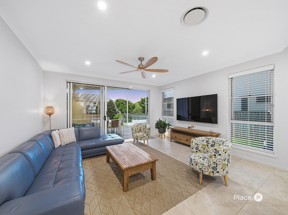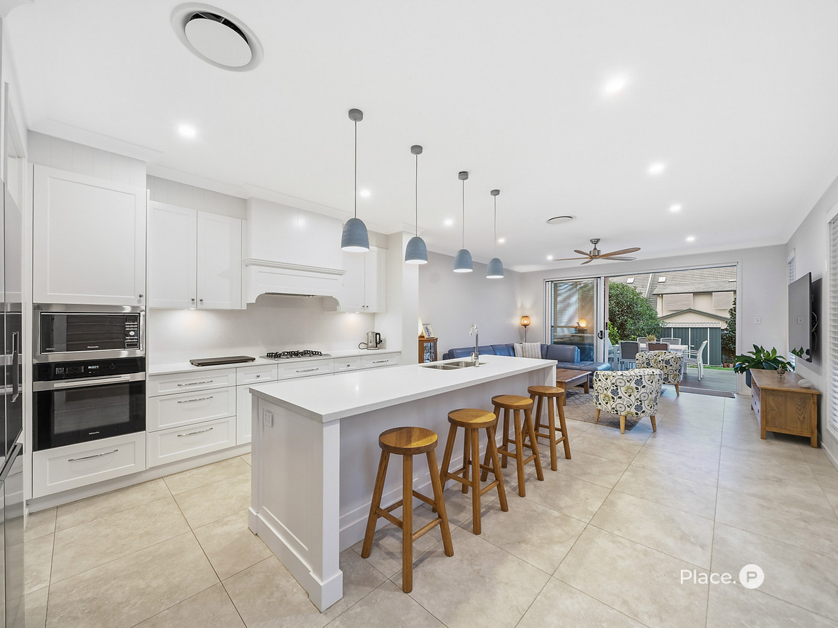 A soaring light-filled void crowns the expansive open-plan living and dining zone, enhancing the sense of space and natural flow. The stunning shaker-style kitchen forms the heart of the home, complete with a generous island bench perfect for casual gatherings, premium Miele appliances including oven, gas cooktop and dishwasher, and a fully appointed butler’s pantry for seamless entertaining. Feature pendant lighting defines the dining area, while the spacious family living zone extends effortlessly through to the covered outdoor deck, creating a true indoor-outdoor lifestyle ideal for Queensland living.