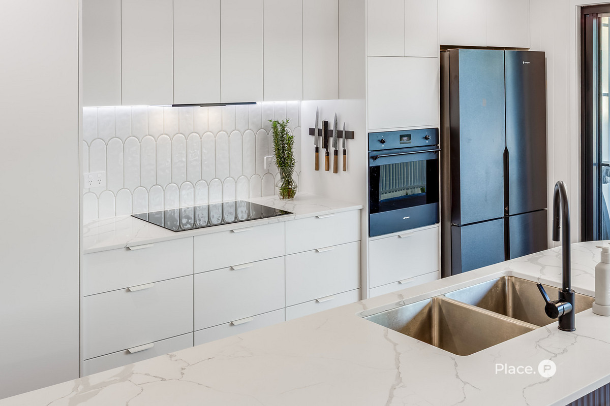 Upstairs features three spacious bedrooms and two bathrooms, including a luxurious master suite with a walk-in robe and a stunning en-suite complete with his & hers vanities. The light-filled open-plan living area boasts raked ceilings and polished hardwood floors, flowing seamlessly to a new hardwood deck overlooking the expansive backyard. The kitchen is a showstopper, fitted with European appliances, including a Smeg induction cooktop, Smeg oven, and Bosch integrated dishwasher, ideal for those who love to cook and entertain.