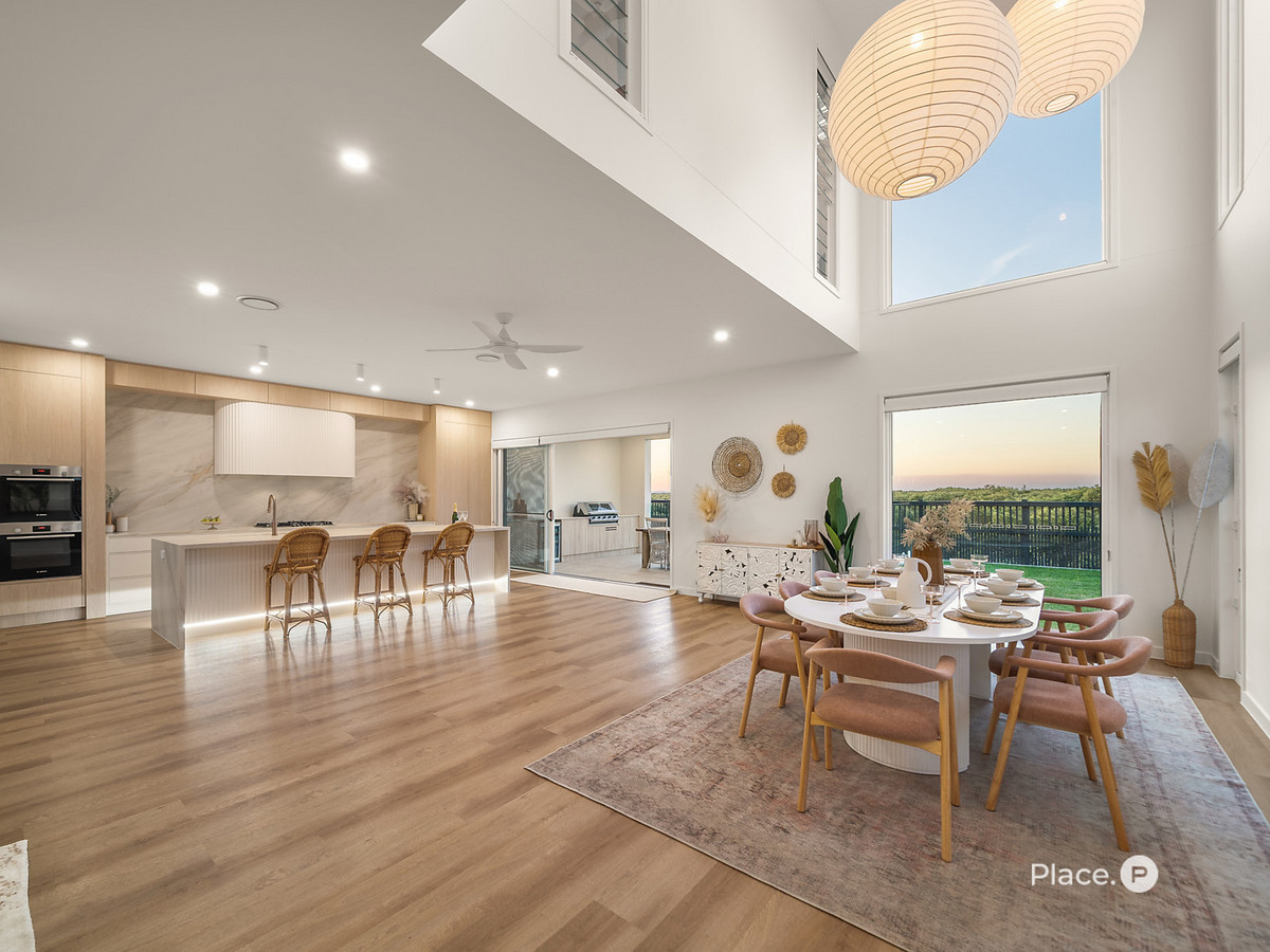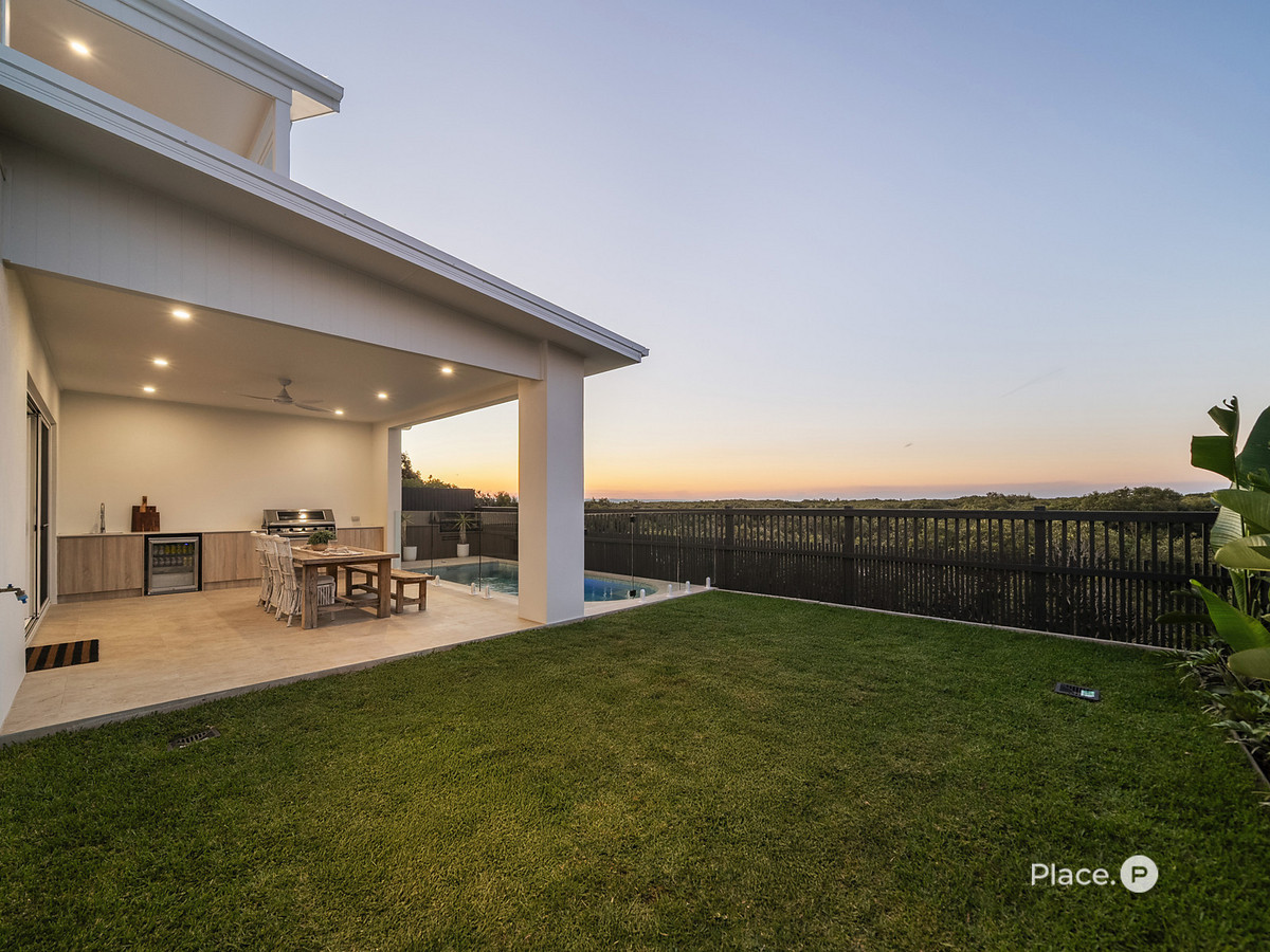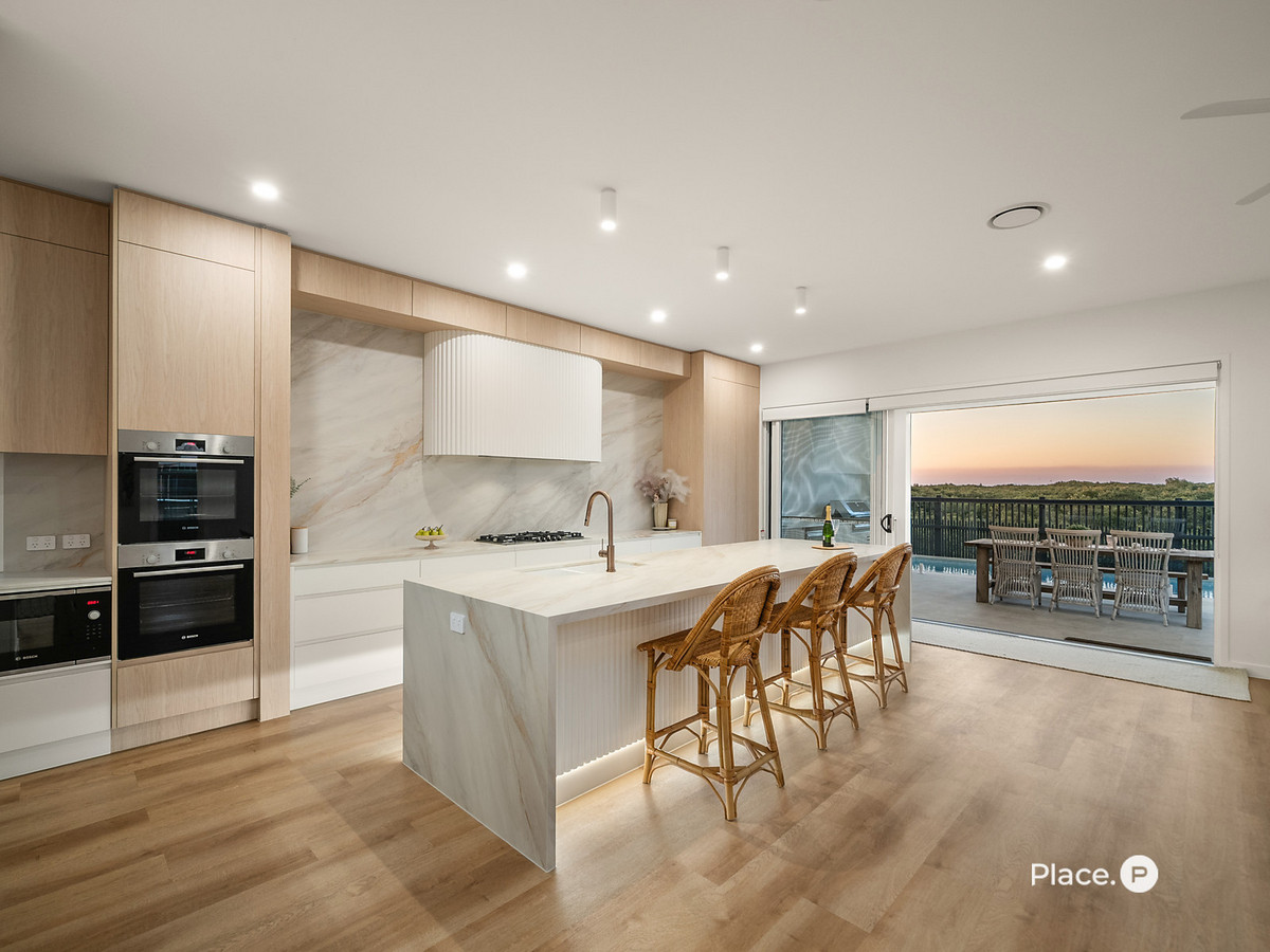 Accommodation is equally indulgent, with a master retreat designed as a private sanctuary with curved architectural walls, a freestanding bath, dual walk-in showers, generous robe and a north-facing balcony that invites quiet moments with your morning coffee or an evening nightcap as the sun sets behind the Glasshouse Mountains. Upstairs, two additional bedrooms, a media lounge with wet bar, and a walk-in linen cupboard create a haven for family living. Flexibility is at the forefront, with a dedicated office or fifth bedroom plus a ground-floor guest suite with ensuite, walk-in robe and private external access – ideal for multigenerational living, visiting guests, or a seamless home business setup.