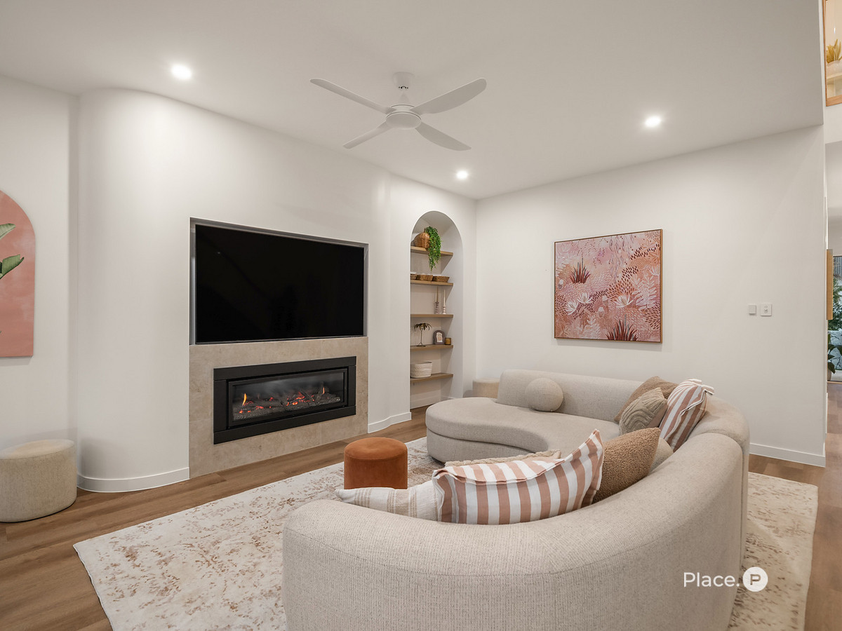 – Living/lounge with built-in shelving, curved wall feature & gas fireplace