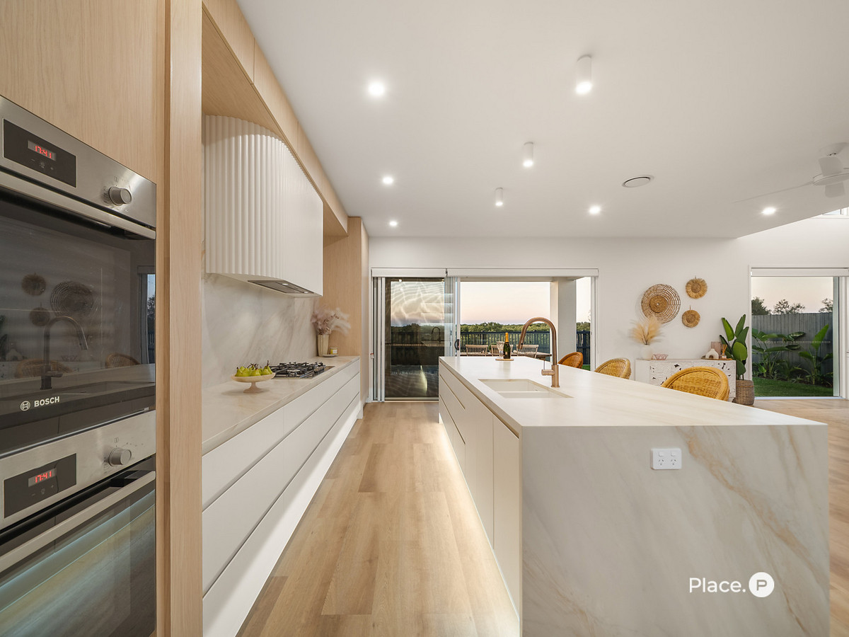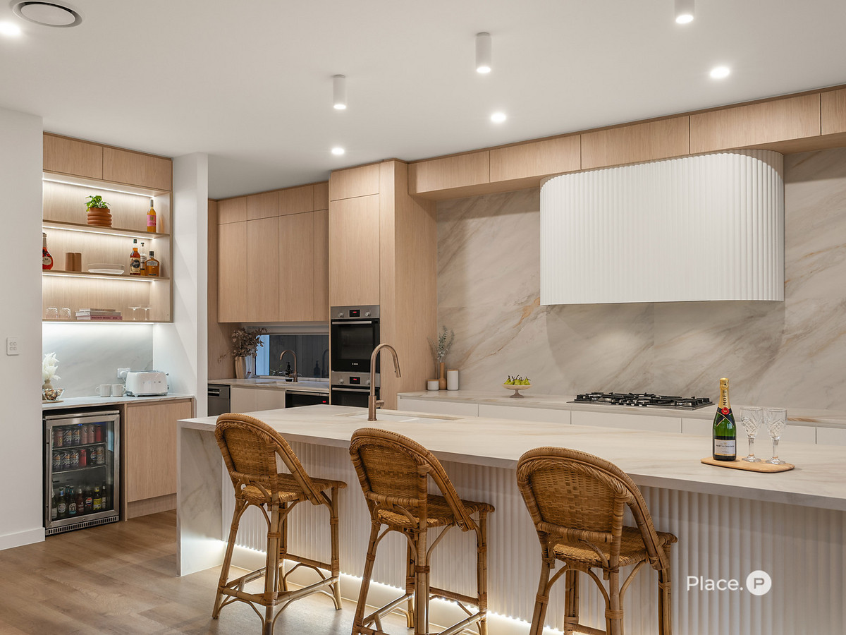 Crafted for both entertaining and everyday living, the home’s heart is its luxury chef’s kitchen – a culinary stage with dual Bosch ovens, gas cooktop, butler’s pantry, and a dedicated bar, all flowing effortlessly into the living and dining zones. Beyond, stacker doors glide open to reveal a north-facing alfresco sanctuary with an outdoor kitchen, mosaic-tiled pool, and lush tropical gardens – a private haven where weekends stretch long and lazy, and every gathering feels like a celebration.