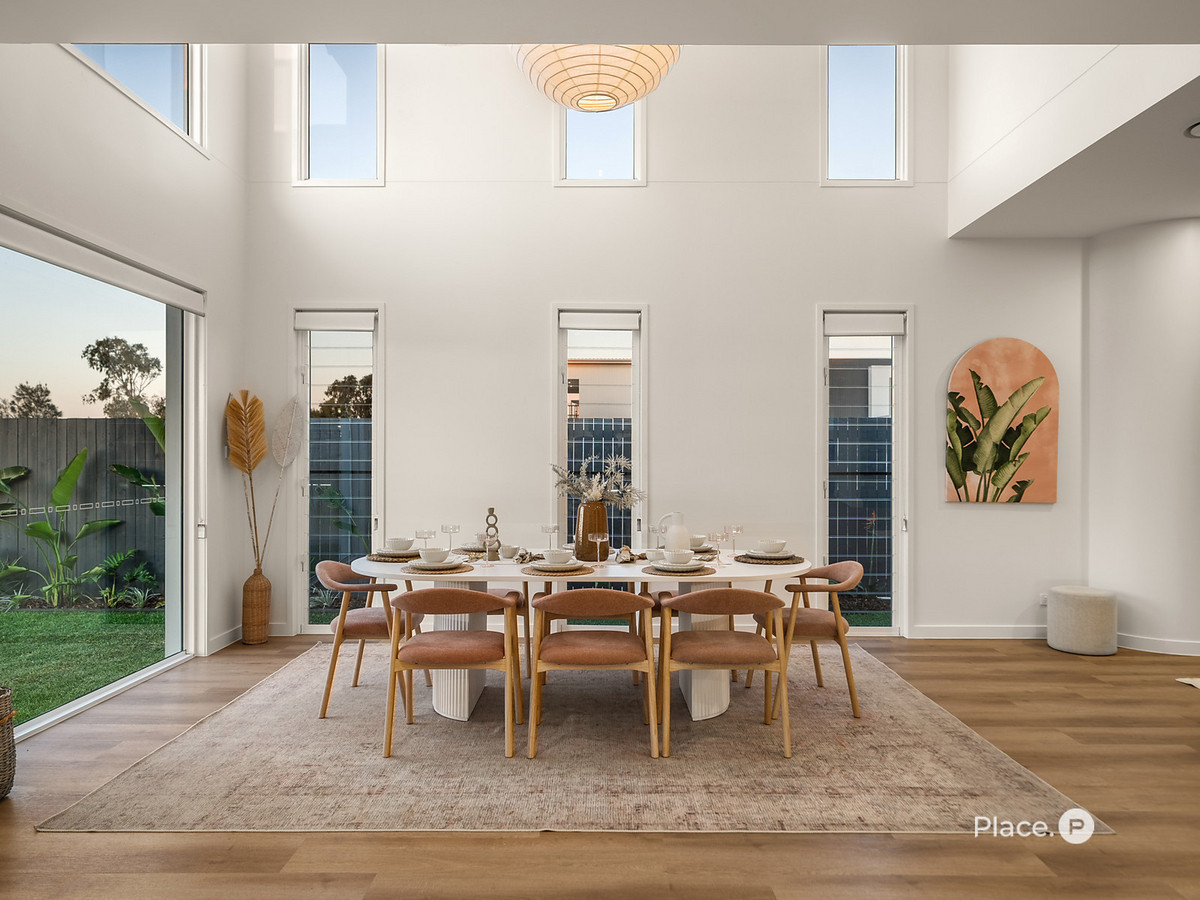 – Airy dining with feature pendant lighting & 3m ceiling