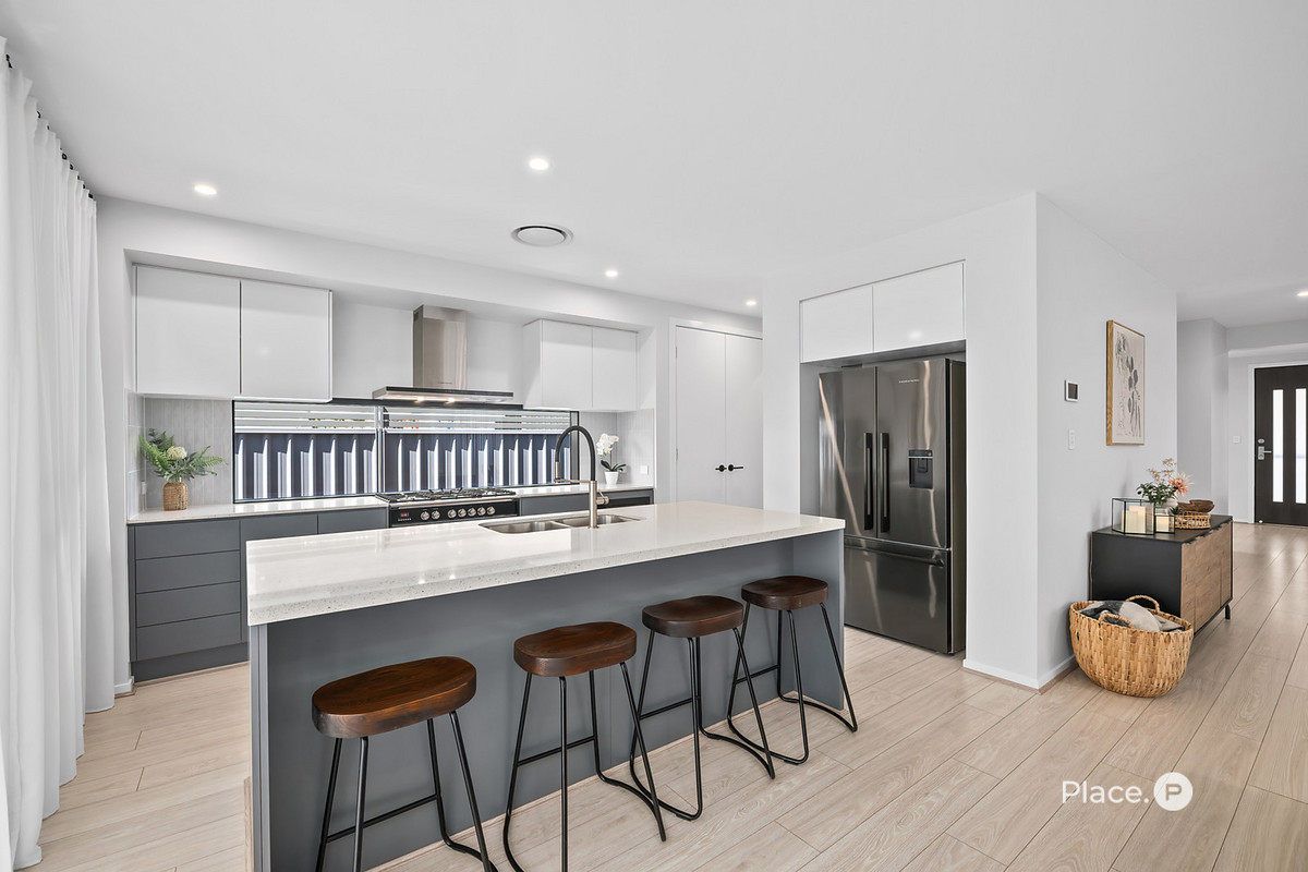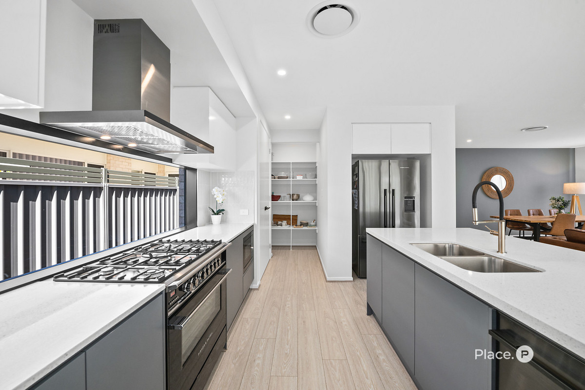 2 separate living zones provide room for everyone to relax or entertain, expansive windows ensure each space is bathed in natural light. At the heart of the home, the gourmet kitchen is a showpiece, complete with Fisher & Paykel appliances, a 900mm freestanding oven with gas cooktop, walk-in pantry, and plumbed fridge space.
