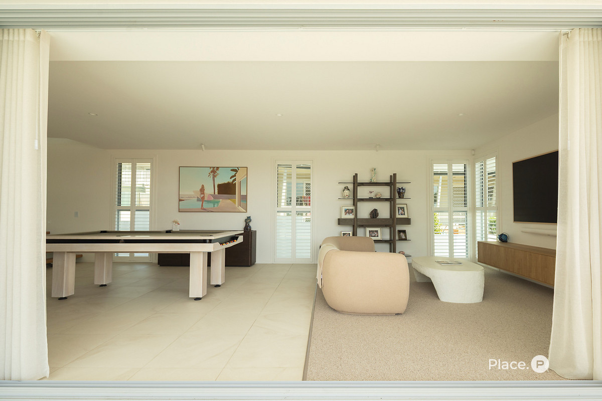 On the mid level, the ultimate entertainer’s domain awaits featuring a generous retreat, games room, and a designer kitchenette and bar finished in exquisite Silver Travertine. Outside, every element of resort-style living has been considered. A sparkling mineral pool takes centre stage amid lush landscaping, complemented by a poolside deck, outdoor shower, and a Vergola-covered alfresco zone designed for year-round enjoyment with a backdrop on ocean vistas.