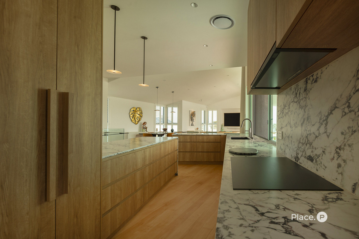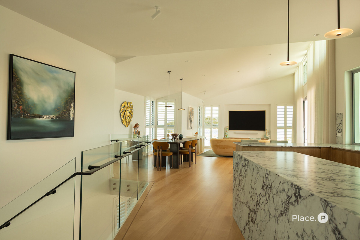Flooded with natural light and framed by sweeping water and mountain vistas, the home unfolds across three expansive levels designed for both flexible family living and grand-scale entertaining. The upper floor welcomes you with soaring 2.7-metre ceilings and a seamless flow between living, dining, and outdoor spaces. Here, the showpiece kitchen commands attention with its bespoke joinery, hand-selected Calacatta stone, and an exclusive suite of limited edition Miele appliances, the perfect setting for culinary creativity or casual gatherings with friends and family.