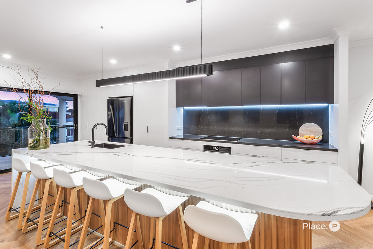 * Designer kitchen with stone waterfall benchtops, coffee nook, ample storage and high-end appliances