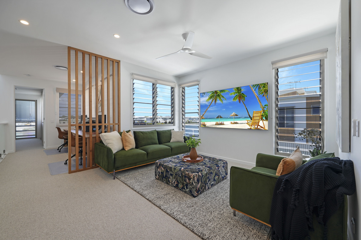 Upstairs, an additional living area and a dedicated study with built-in desks offers ample space for two people to work comfortably from home.