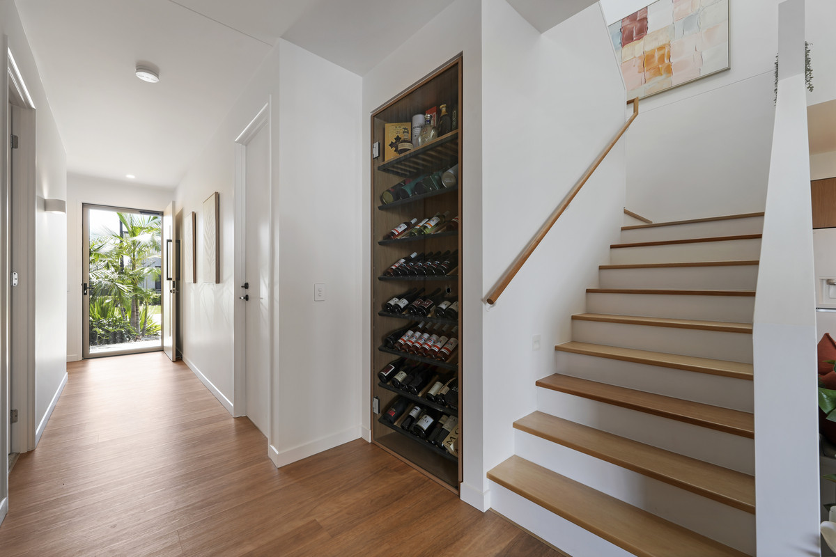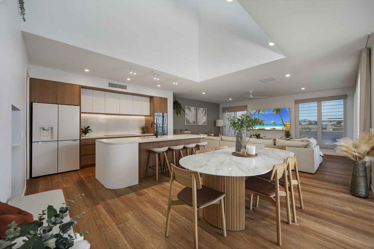 * Open-plan living with timber flooring and void-style ceiling
